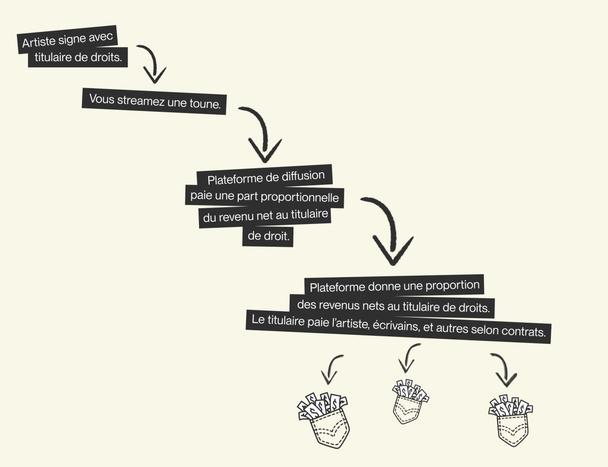 Quels que soient vos goûts en matière de musique ou de plateformes d’écoute (même Youtube Music), on fait tous partie d'une nouvelle ère où le simple fait d'appuyer sur Play et d'écouter nos chansons préférées équivaut à plus de pain sur la table pour nos artistes. Mais dans certains cas, c’est une très grosse miche de pain qui, comme nous le savons maintenant, est ensuite brisée en petits morceaux et divisée par le titulaire de droits.