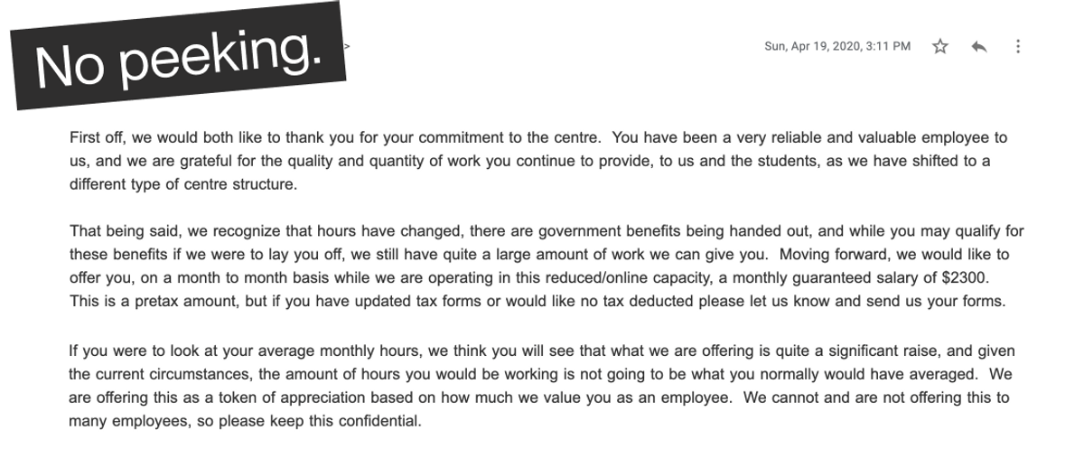 In short, they did not match my value with the pay they offered me. This was essentially what they were doing to everyone. (I may have snooped through everyone’s cheques one day. Pro tip: if you’re going to be shady about payment practices, don’t put all your employees’ cheques in open envelopes with their names on it.)
